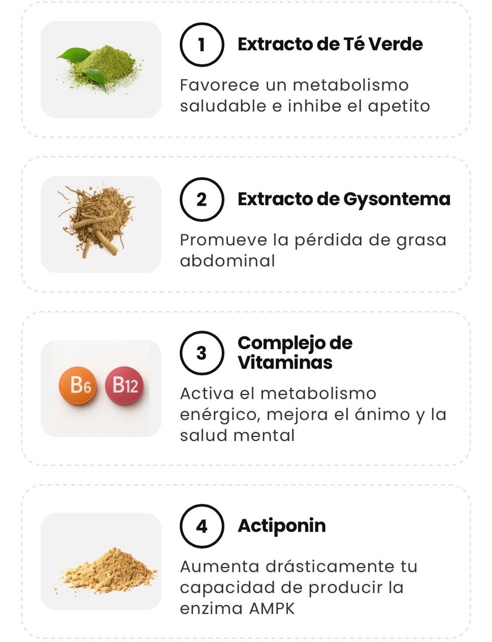 • Extracto de Té Verde (EGCG 60%): 400 mg - Potencia la señal AMPK