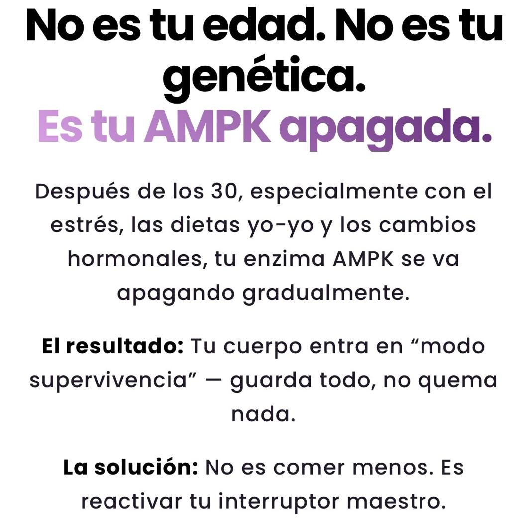 ¿Sabías que tu cuerpo tiene un “interruptor maestro” que decide si almacenas grasa o la quema? Se llama enzima AMPK y cuando está apagada (como le ocurre al 73% de las mujeres después de los 30 en Latinoamérica), tu metabolismo entra en modo “ahorro”.
